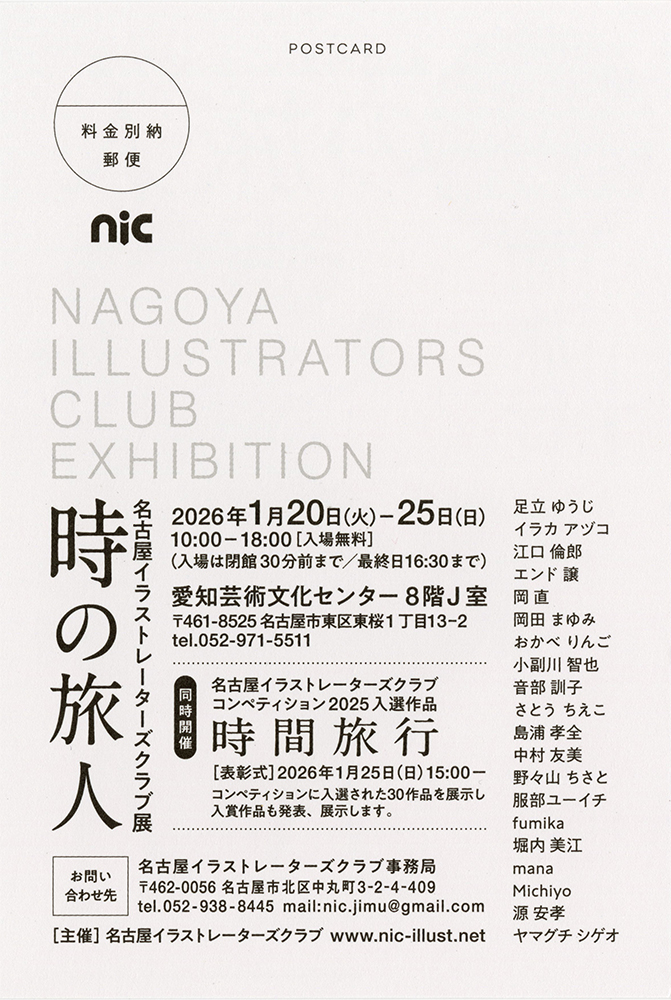 exhibition, information 展覧会のお知らせ 名古屋イラストレーターズクラブ展 2025年12月13日 コメントはまだありません 令和8年1月20日(火)から25日(日)の期間、愛知芸術文化センター8階J室に於きまして名古屋イラストレーターズクラブ展が開催されます。ぜひお出かけください。 Continue Reading