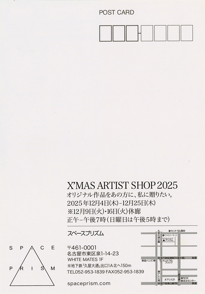 exhibition, information 展覧会のお知らせ 2025年12月6日 コメントはまだありません 令和7年12月4日(木)から25日(木)の期間、久屋大通にありますスペースプリズムに於きまして「X’MAS ARTIST SHOP 2025」が開催されます。3点ほど出品しております。お時間ご都合よろしければぜひお出かけください。 Previous Post Next Post You may also like 2025年2月8日 個展のお知らせ 今は昔の物語 2019年3月13日 名古屋造形大学公開講座 2019年11月13日 名古屋イラストレーターズクラブ展